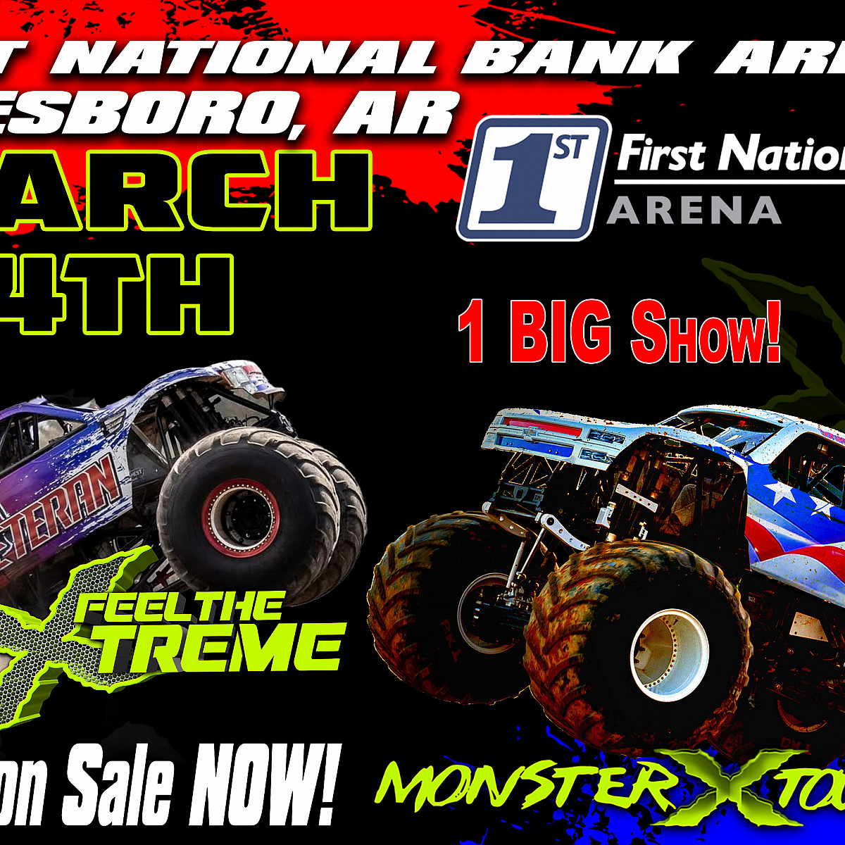 JONESBORO, AR will be motorsport entertainment’s epicenter with the nation’s most competitive MONSTER TRUCKS as the MONSTER X TOUR invades the FIRST NATIONAL BANK ARENA on March 14th for ONE MONSTER SHOW! See these incredible 10,000-pound, car-crushing giants compete in racing, wheelie contests, and then rock the house with amazing freestyle action during the MONSTER X TOUR! Plus, you can meet the drivers and see the trucks up close at the pre-event Autograph Pit Party!